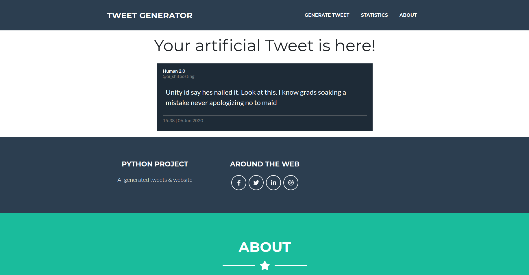 Strona internetowa stworzona na potrzeby projektu na studia. Strona wykorzystuje sieć neuronową, którą zaprojektowaliśmy do generowania tweetów oraz automatycznego postowania ich na naszym Twiterze. Sieć wytrenowana została na ponad 10000 tweetów Donalda Trumpa.